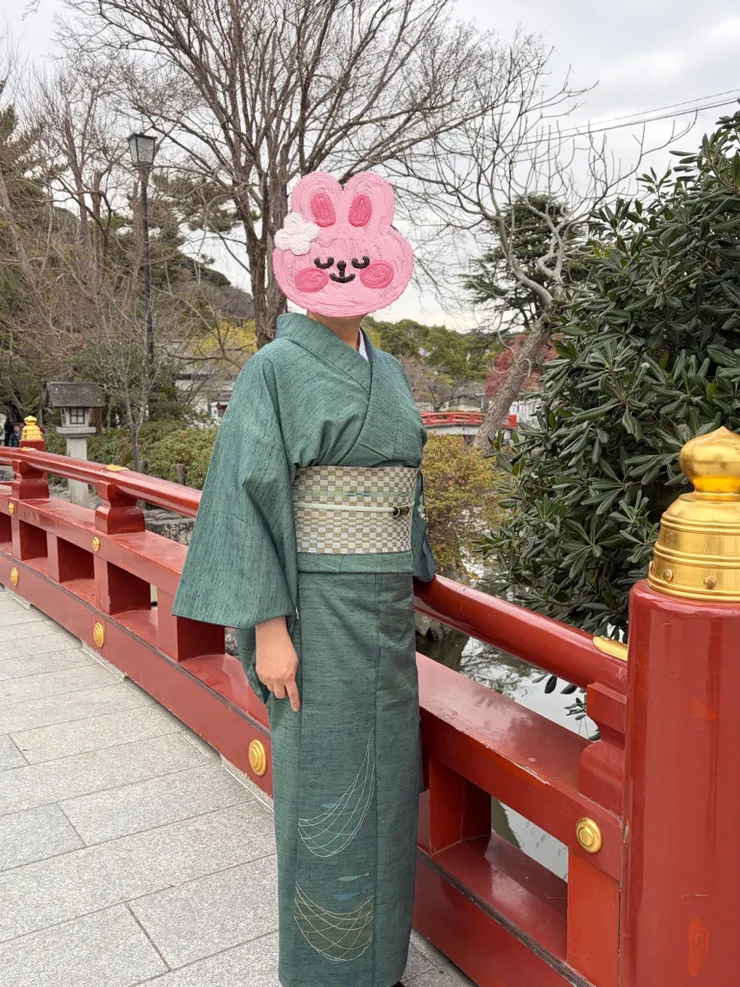 今日の着物は、魚と網のすくい織柄の能州紬👘