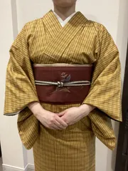 今日はお気に入りの黄八丈に、お初の名古屋帯❤️ラクマで買った中古美品、私の手持ちの中では珍しい正絹です✨(だいたいポリエステルで揃えてます)初めてのワンポイント柄タイプ、難しかったけどまあ変ではない…かな?黄八丈のカラシ色に、燕脂色の帯がよくマッチしました🙌今日はこの格好で北千住までハーブティーを買